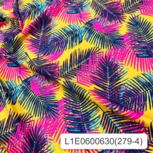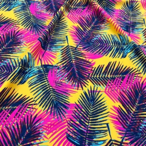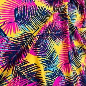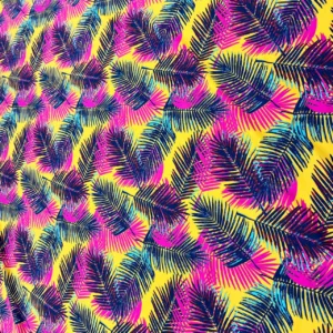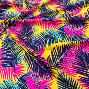 Purple and Blue Leaves Yellow Background Print Nylon Spandex Fabric 4 Way Stretch By Yard for swimwear dancewear gymwear sportwear dress skirt (204-4)