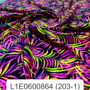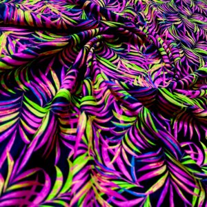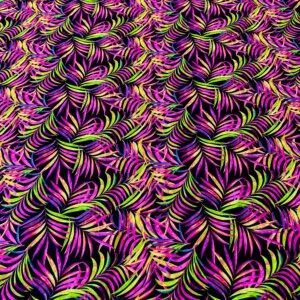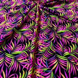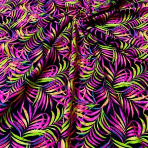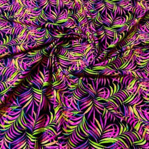 Purple and Neon Green Leaves Black Background Print Nylon Lycra Spandex Fabric 4 Way Stretch By Yard for swimwear dancewear gymwear sportwear dress