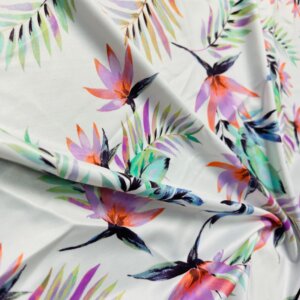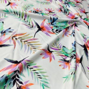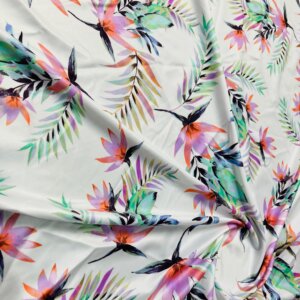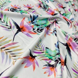Purple and Orange Flowers White Background Print Nylon Lycra Spandex Fabric 4 Way Stretch By Yard for swimwear dancewear gymwear sportwear dress (204-3)