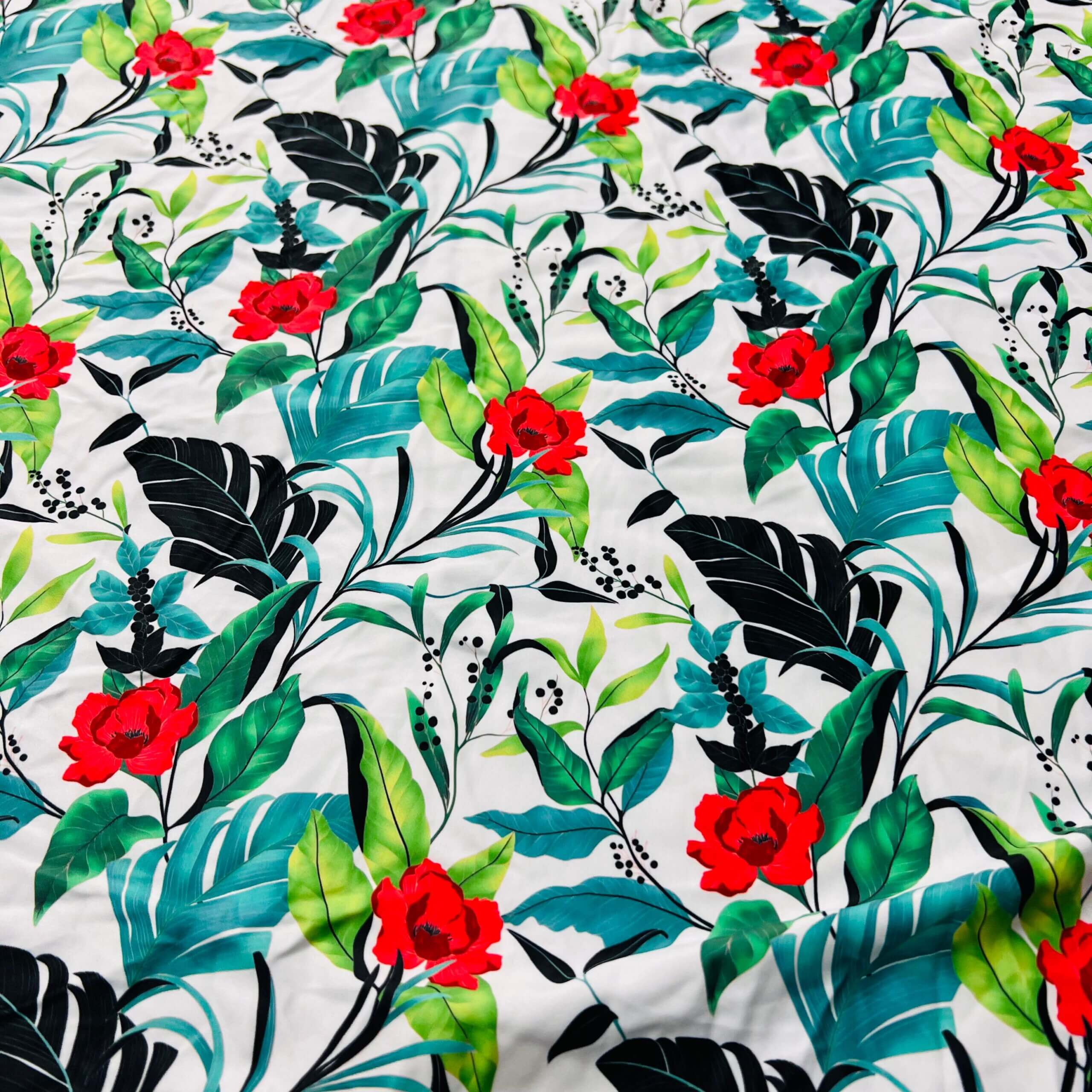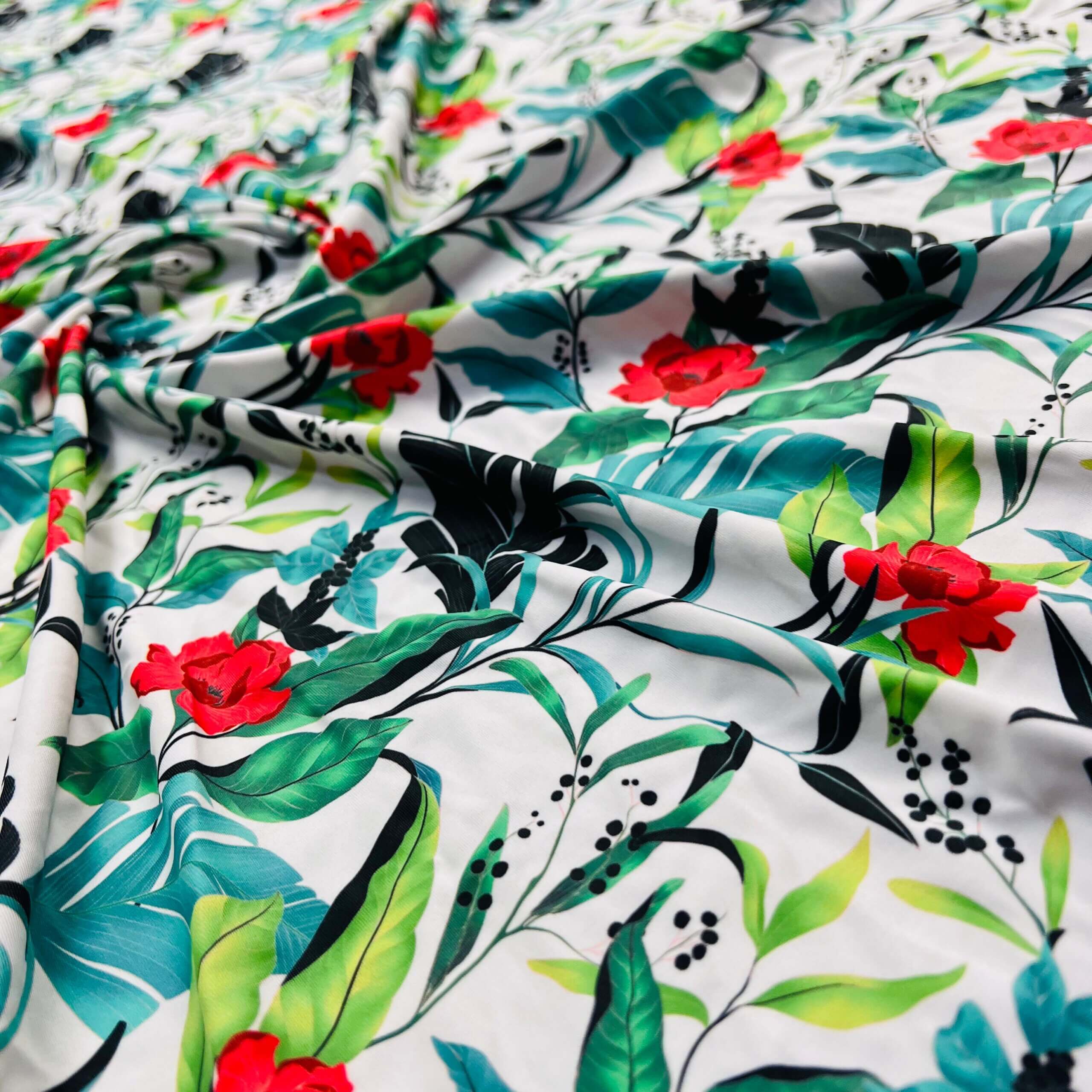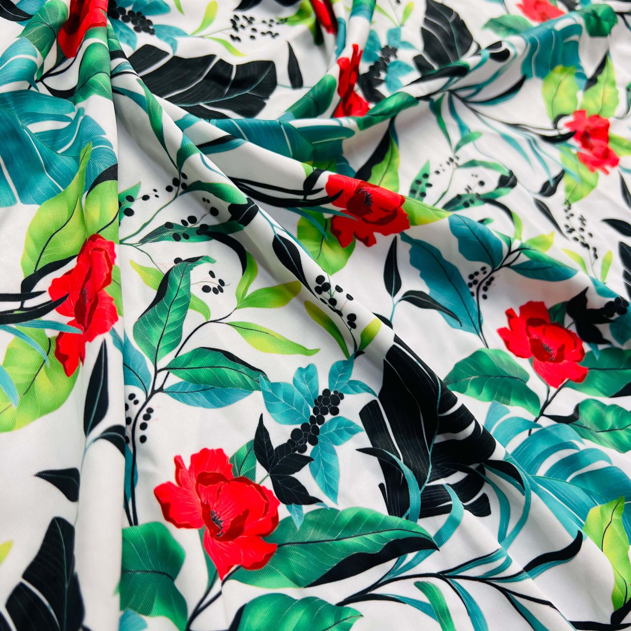 Red Flowers with Green Leaves Print Nylon Spandex Fabric 4 Way Stretch for swimwear dancewear gymwear sportwear dress skirt (203-7)