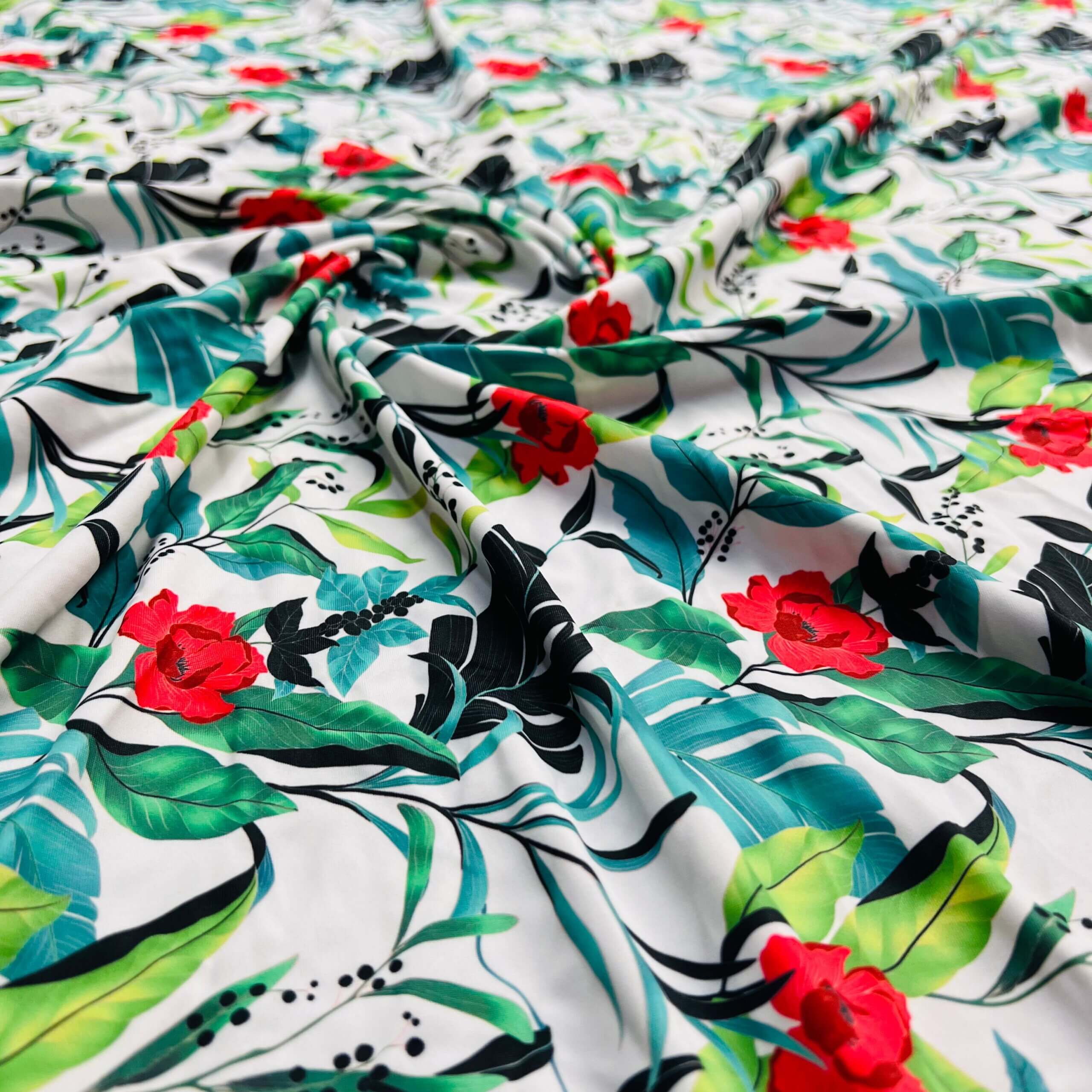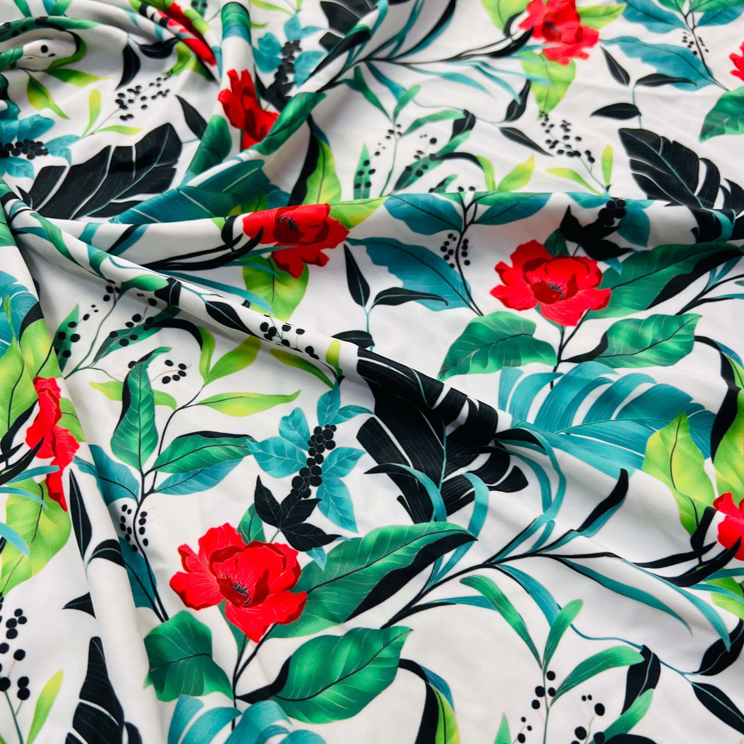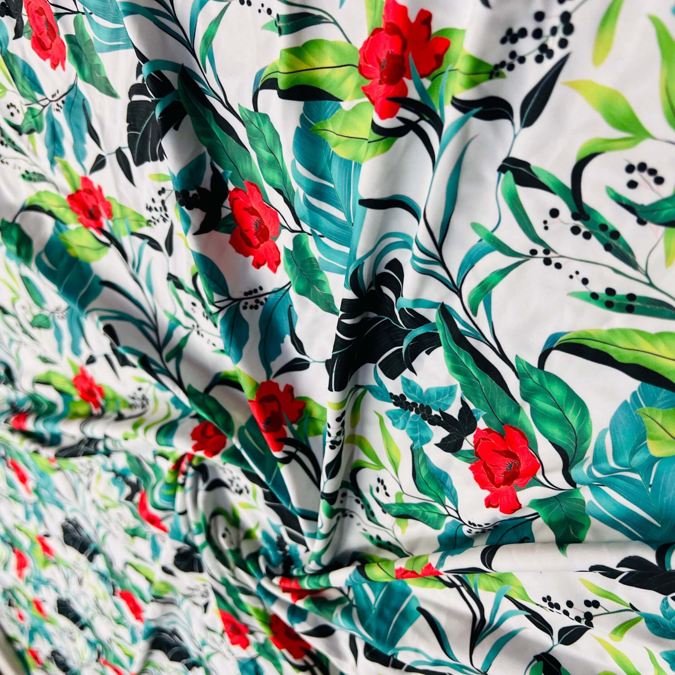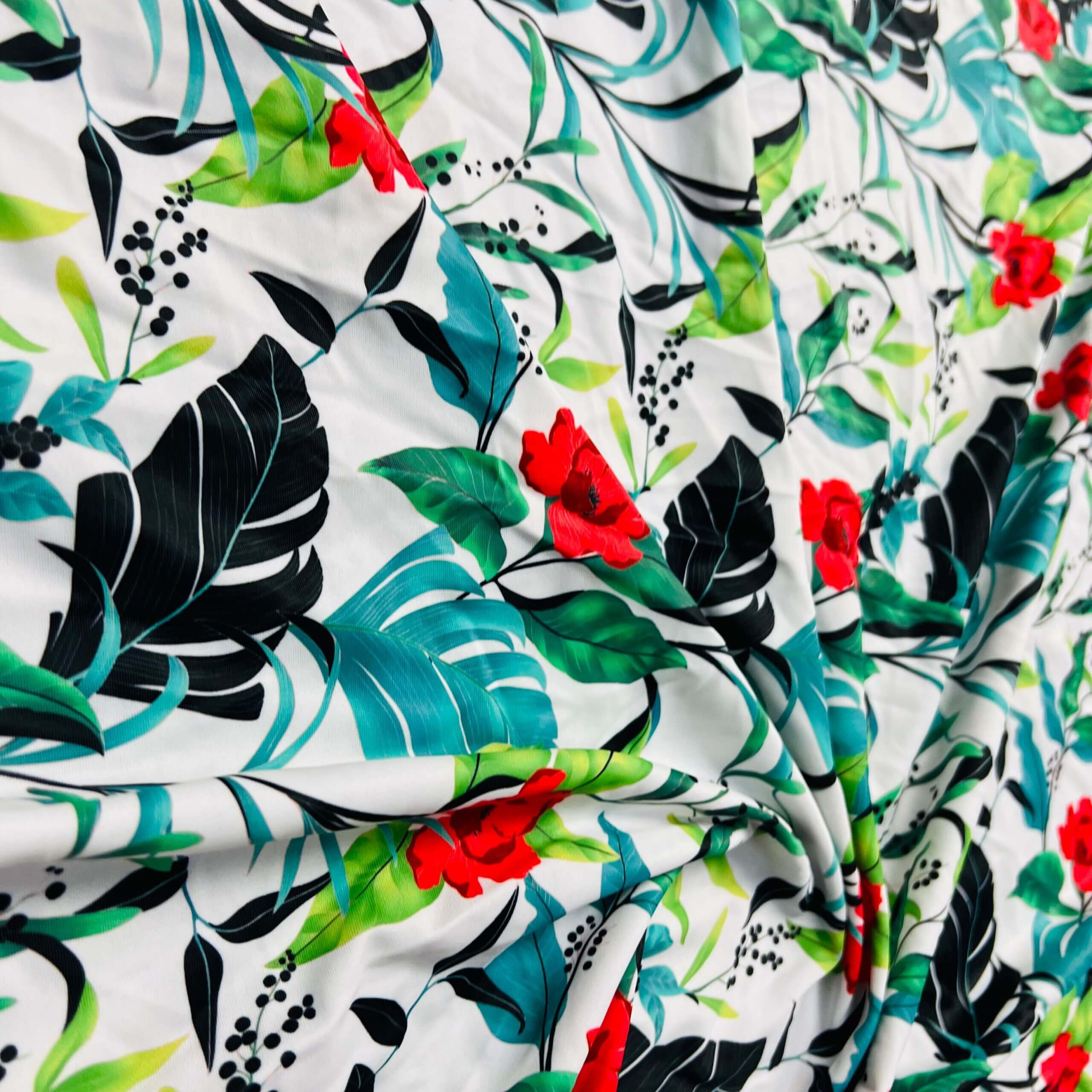 Red Flowers with Green Leaves Print Nylon Spandex Fabric 4 Way Stretch for swimwear dancewear gymwear sportwear dress skirt (203-7)