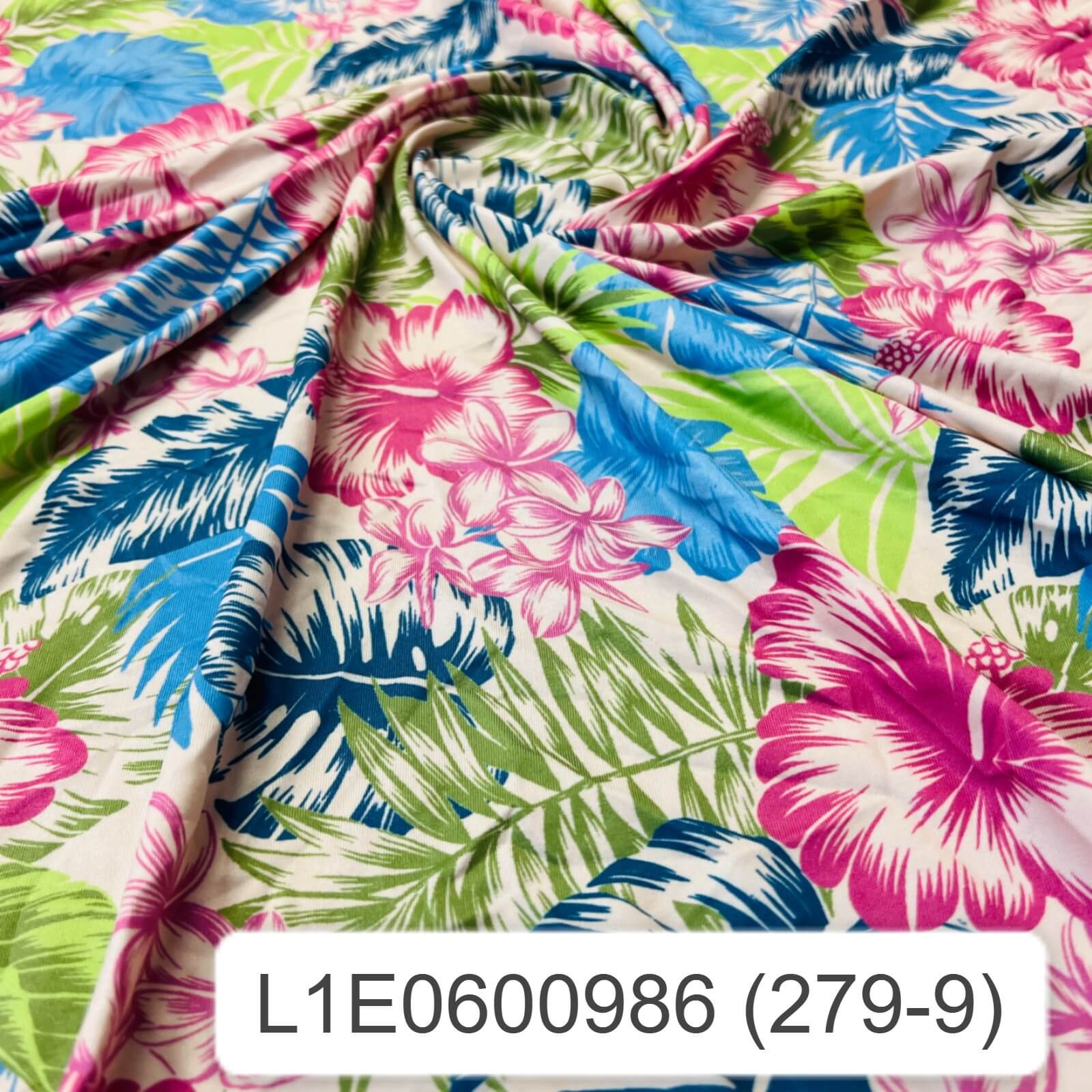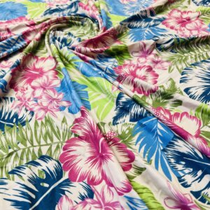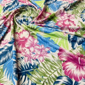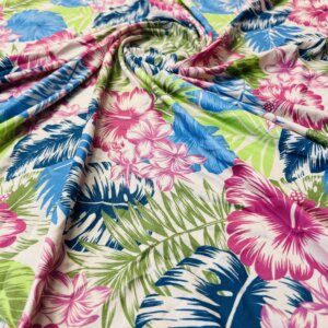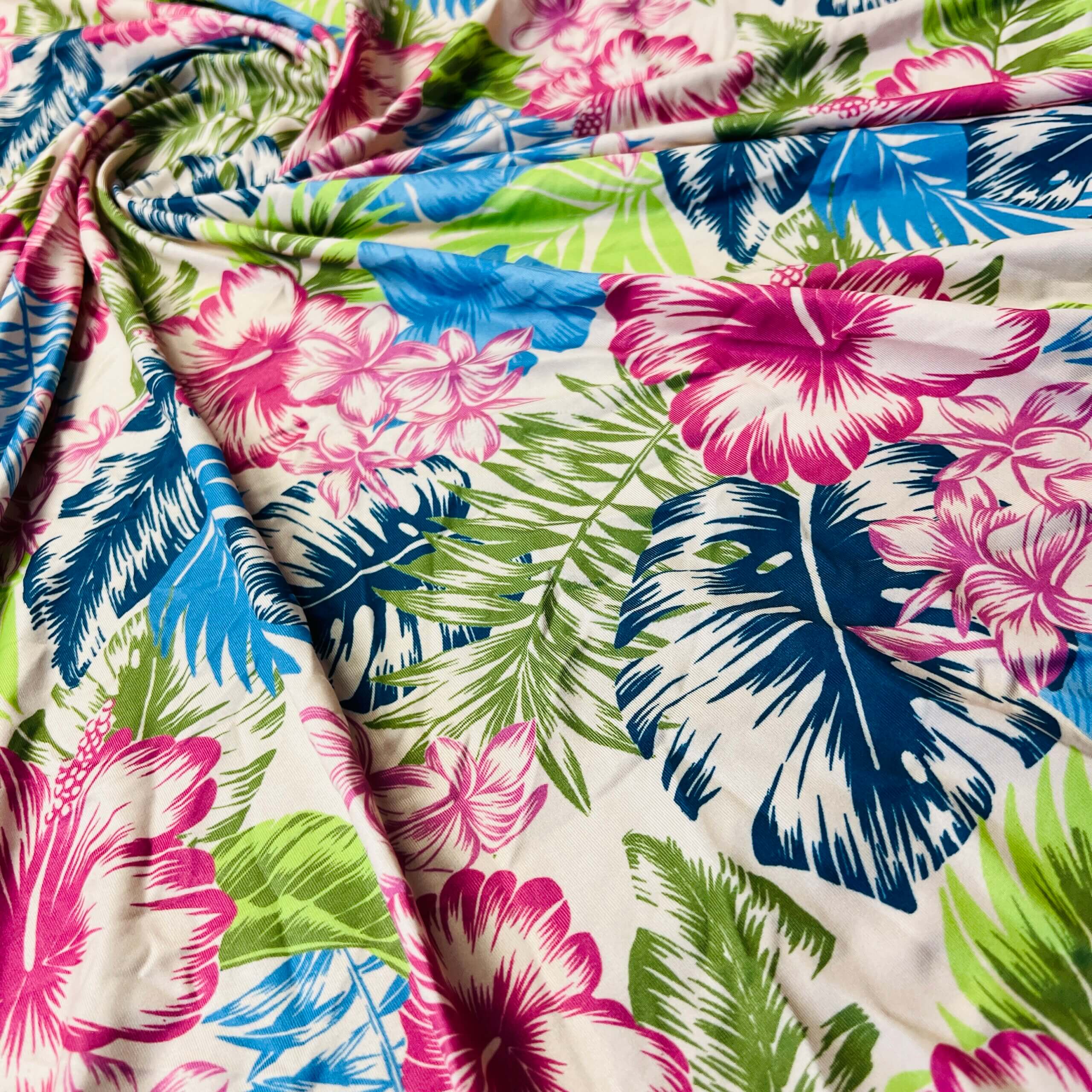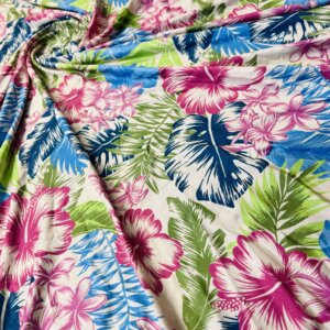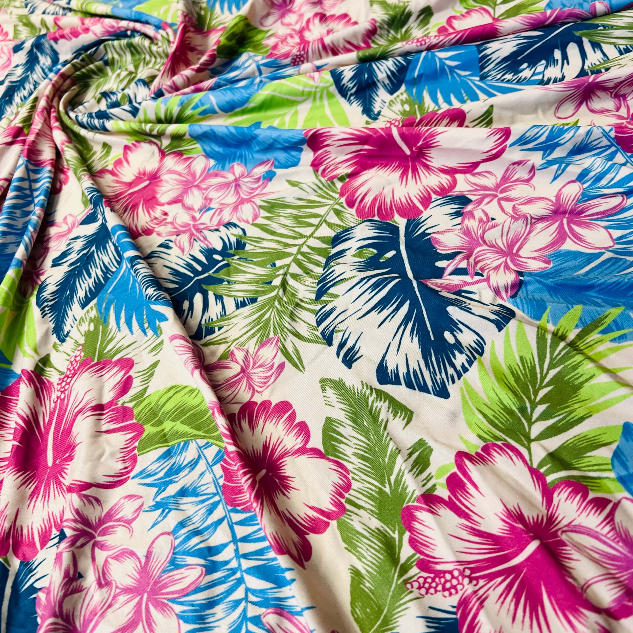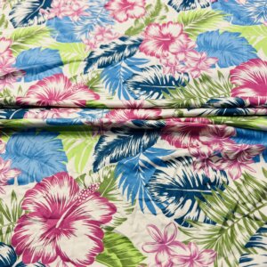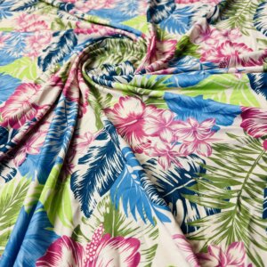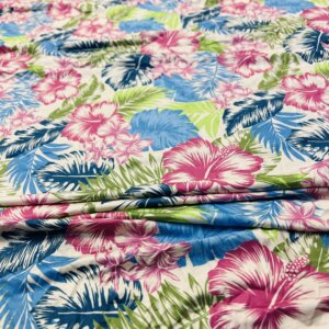 pink flower leaves blue cream Background print Nylon Spandex Fabric 4 Way Stretch for swimwear dancewear gymwear sportwear dress skirt (279-9)