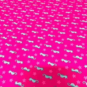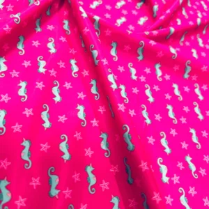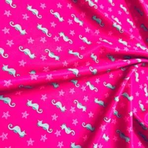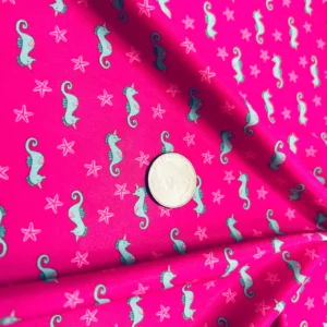 Seahorses with Hot Pink background Print Nylon Lycra Spandex Fabric 4 Way Stretch by Yard for Swimwear, Dancewear, Sportwear, Dress (203-11)