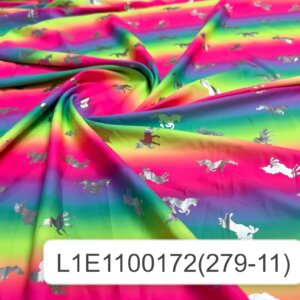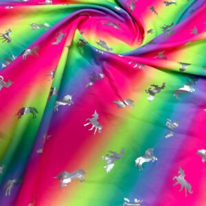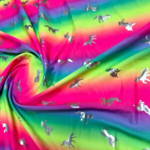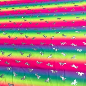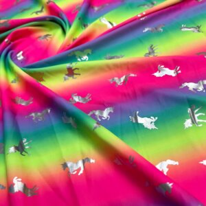Silver Unicorns Rainbow Background Print Nylon Lycra Spandex Fabric 4 Way Stretch By Yard for swimwear dancewear gymwear sportwear dress (279-11)