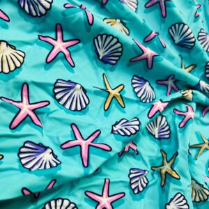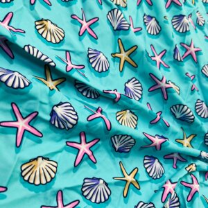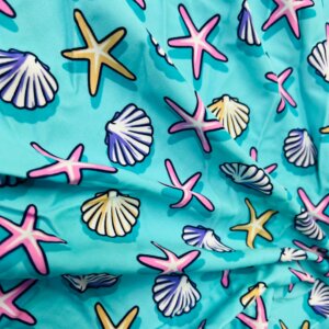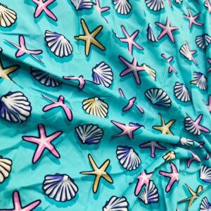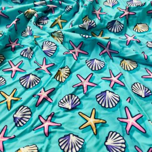 Stars and Sea Clams Aquamarine background Print Nylon Lycra Spandex Fabric 4 Way Stretch By Yard for swimwear dancewear gymwear sportwear dress (239-9)