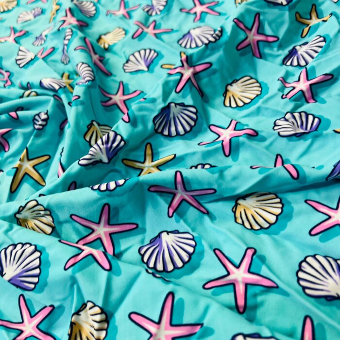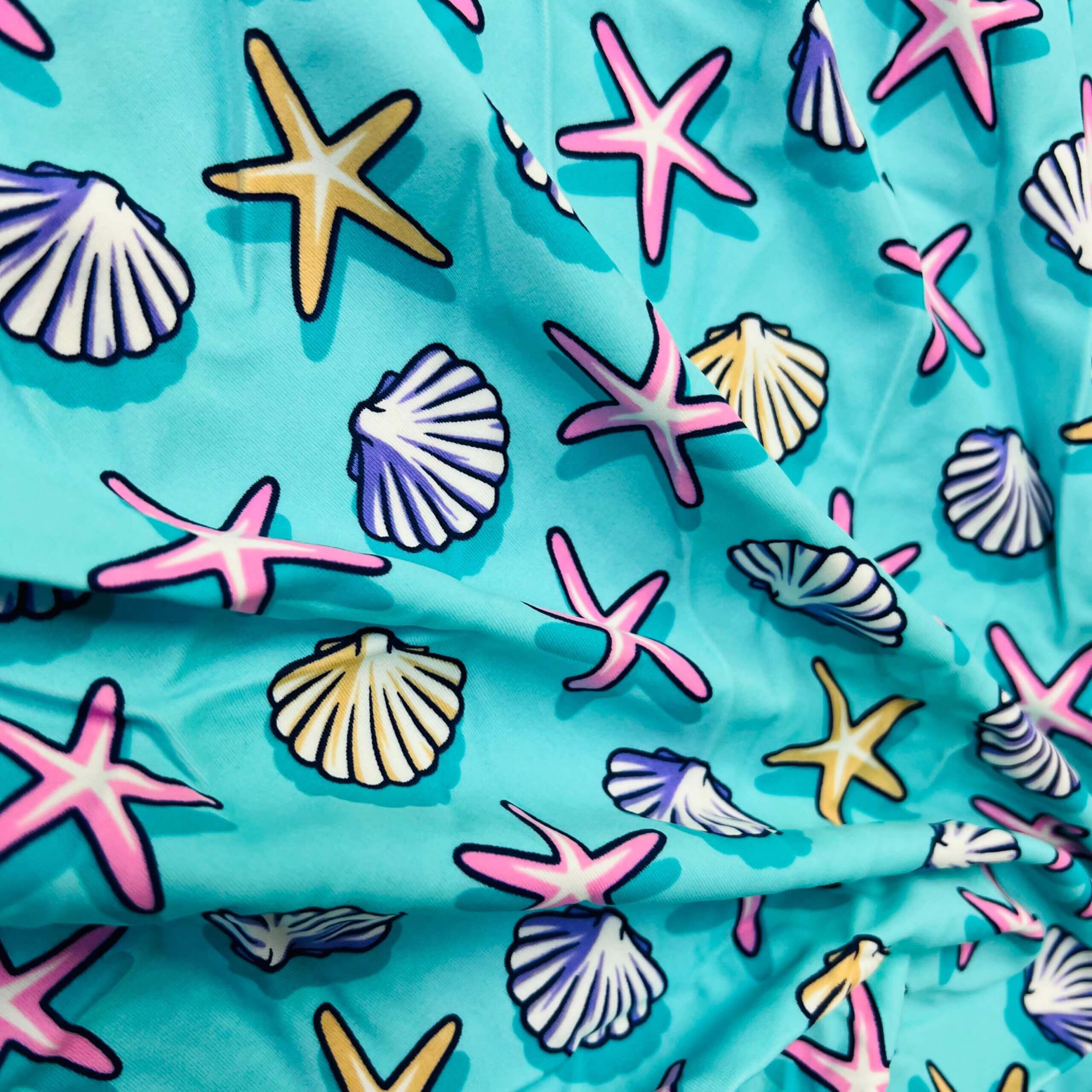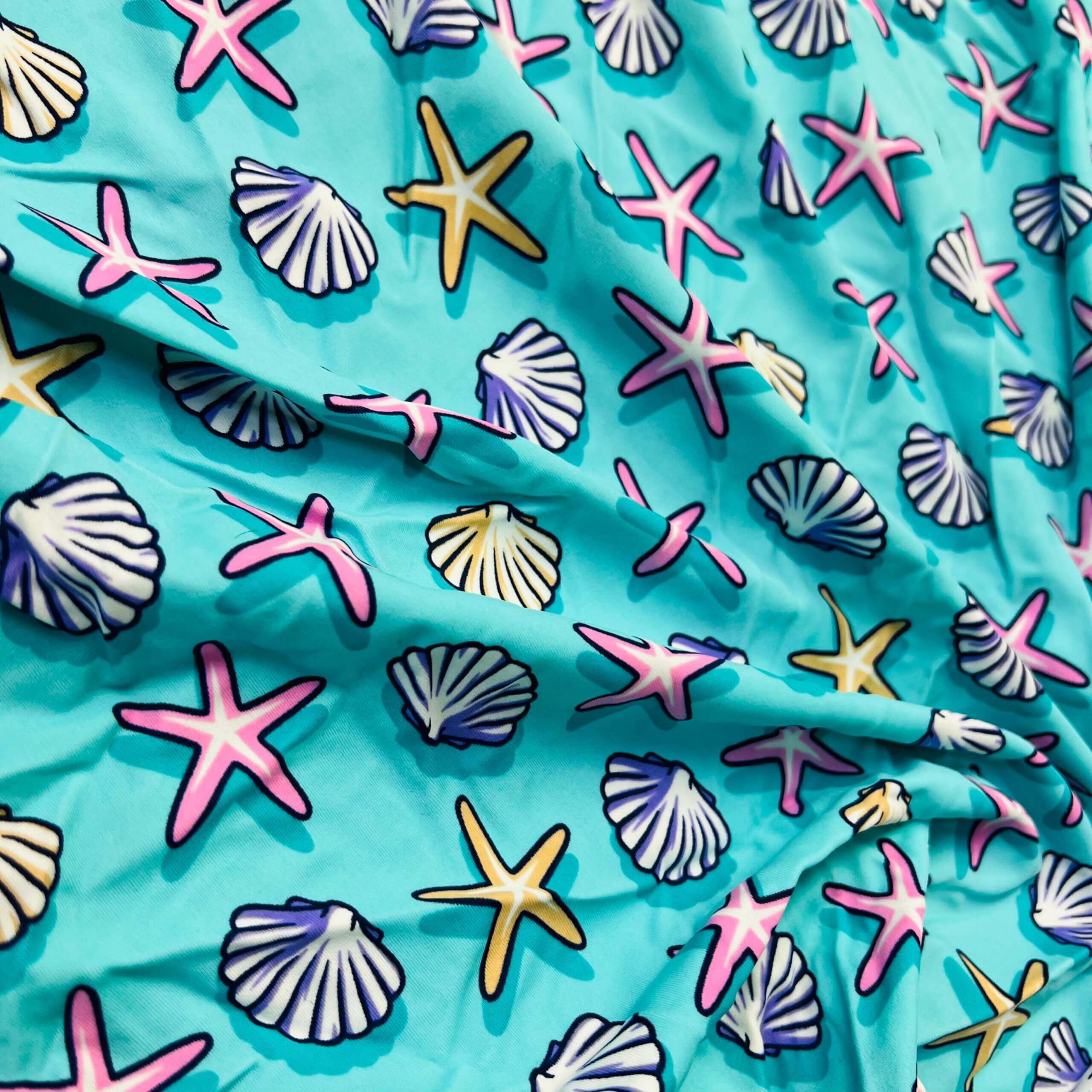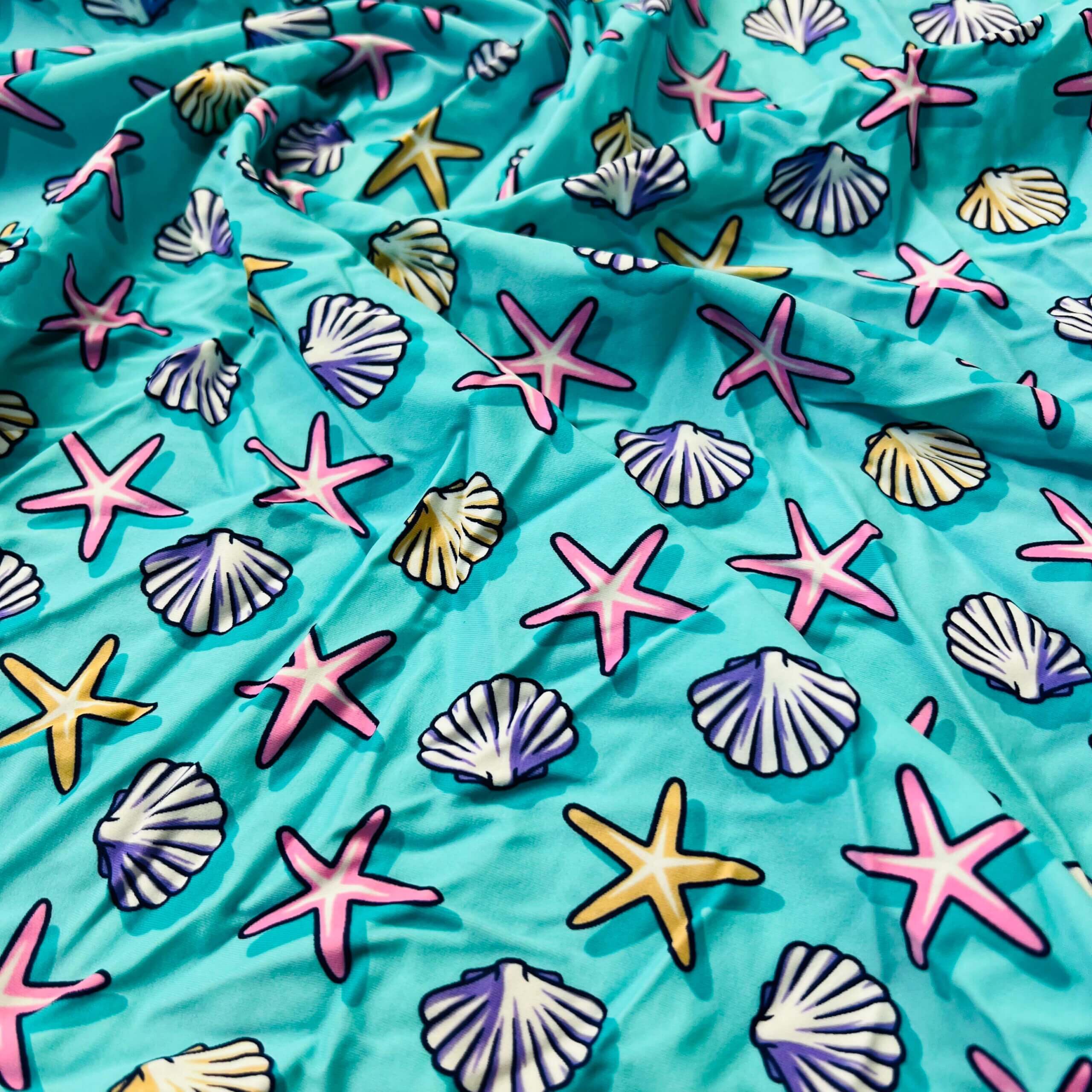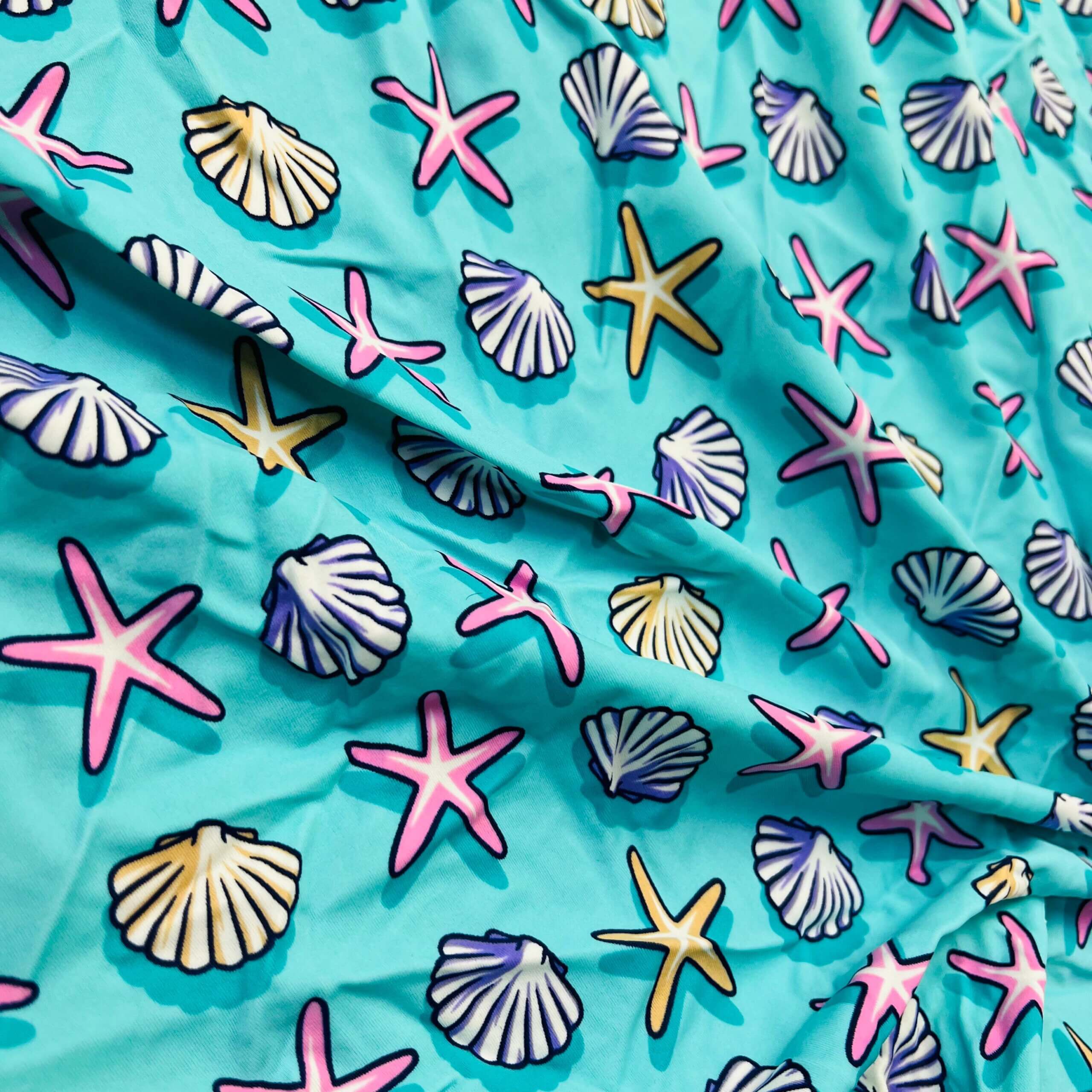 You are visualizing Stars and Sea Clams Aquamarine background Print Nylon Lycra Spandex Fabric 4 Way Stretch By Yard for swimwear dancewear gymwear sportwear dress