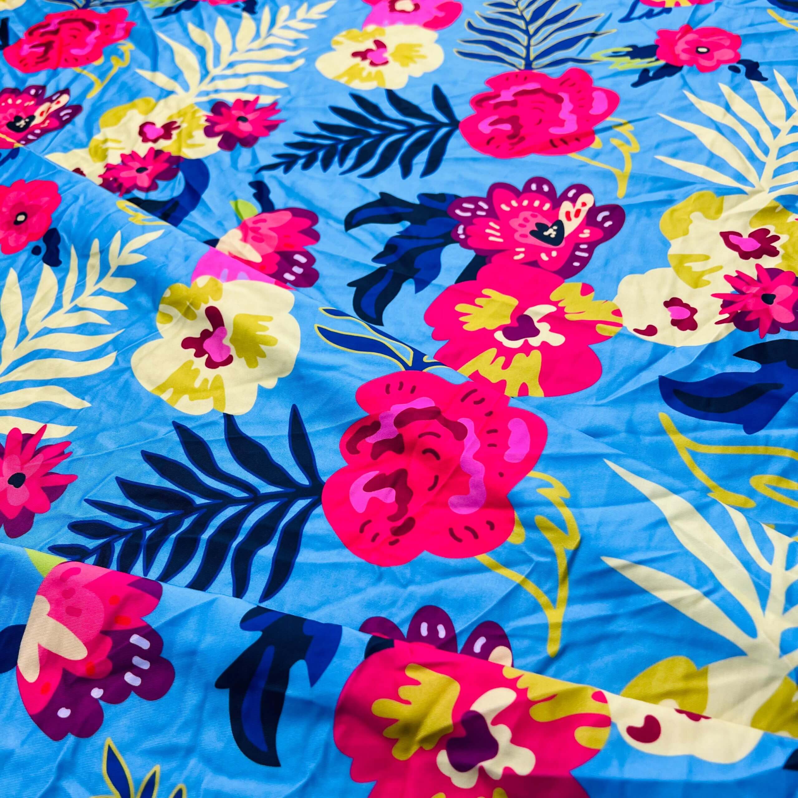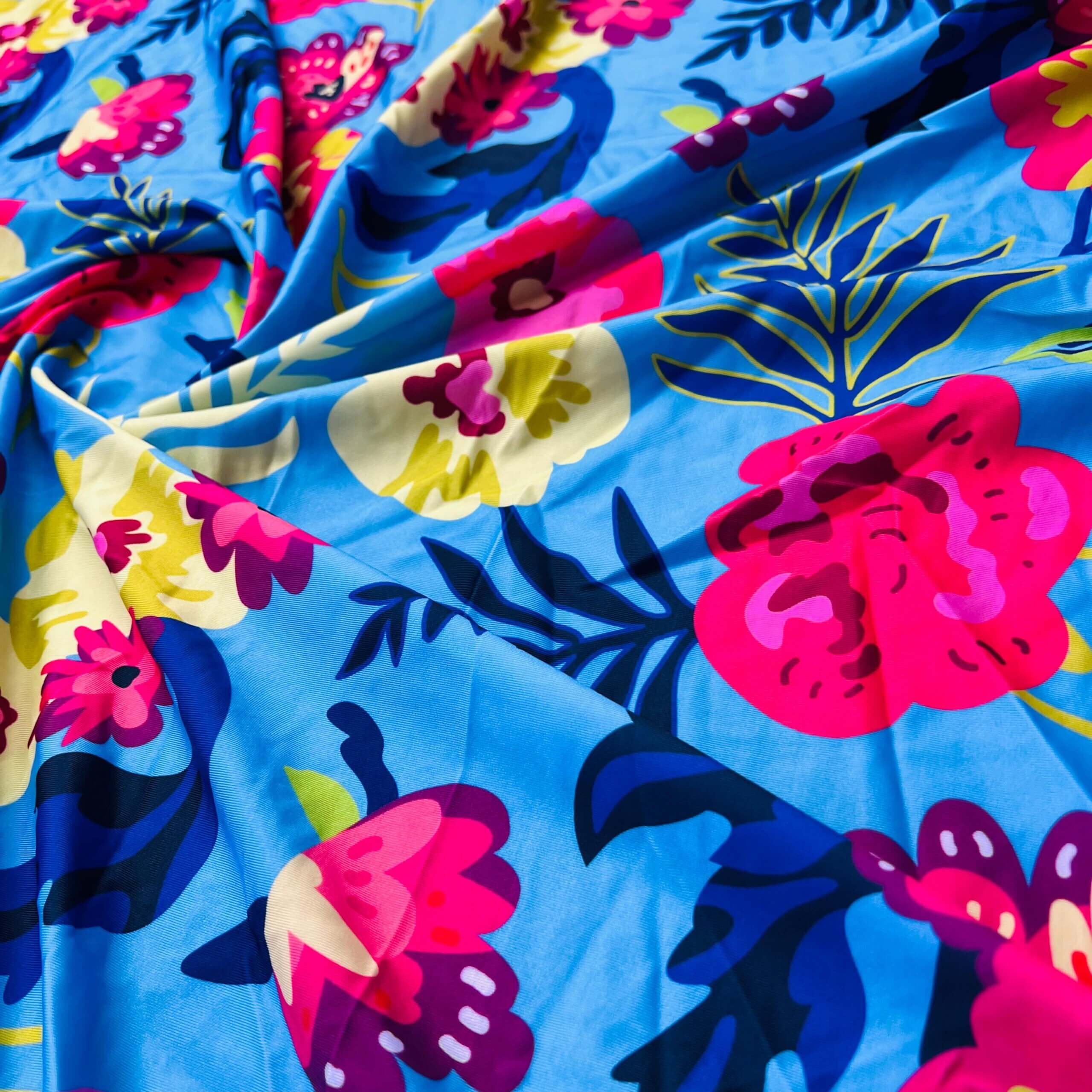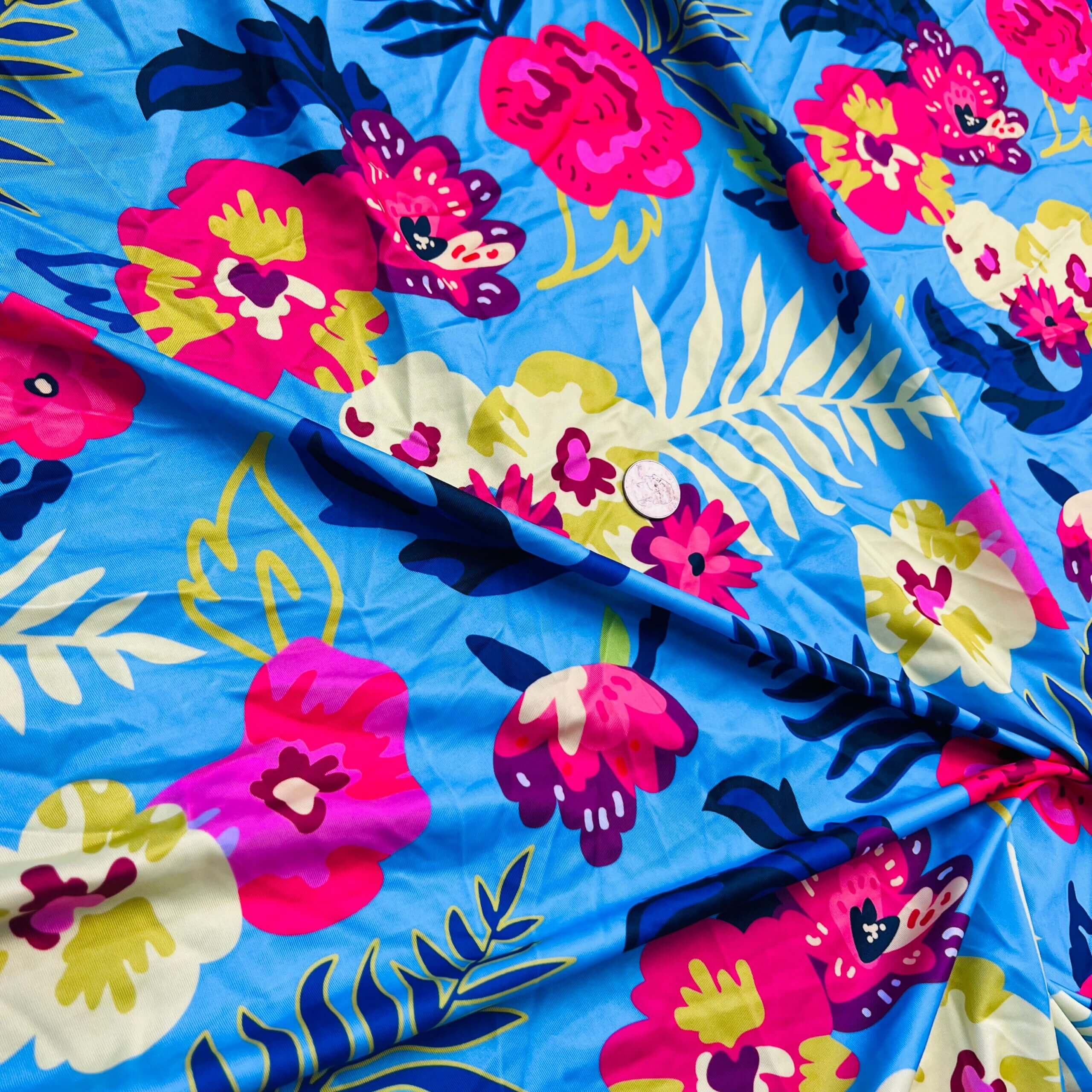 Tropical Flowers Blue Background Print Nylon Lycra Spandex Fabric 4 Way Stretch By Yard for swimwear dancewear gymwear sportwear dress (203-2)