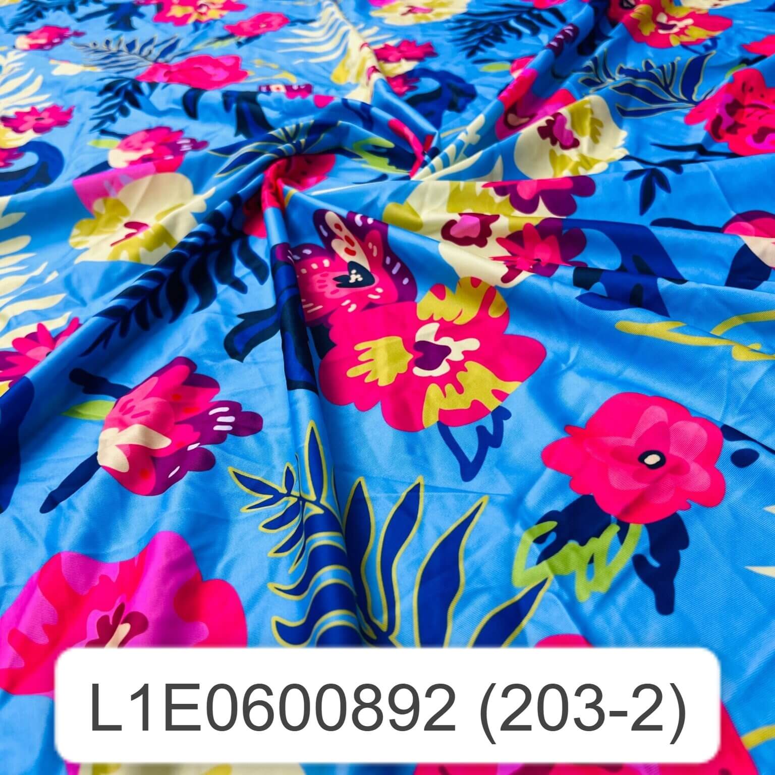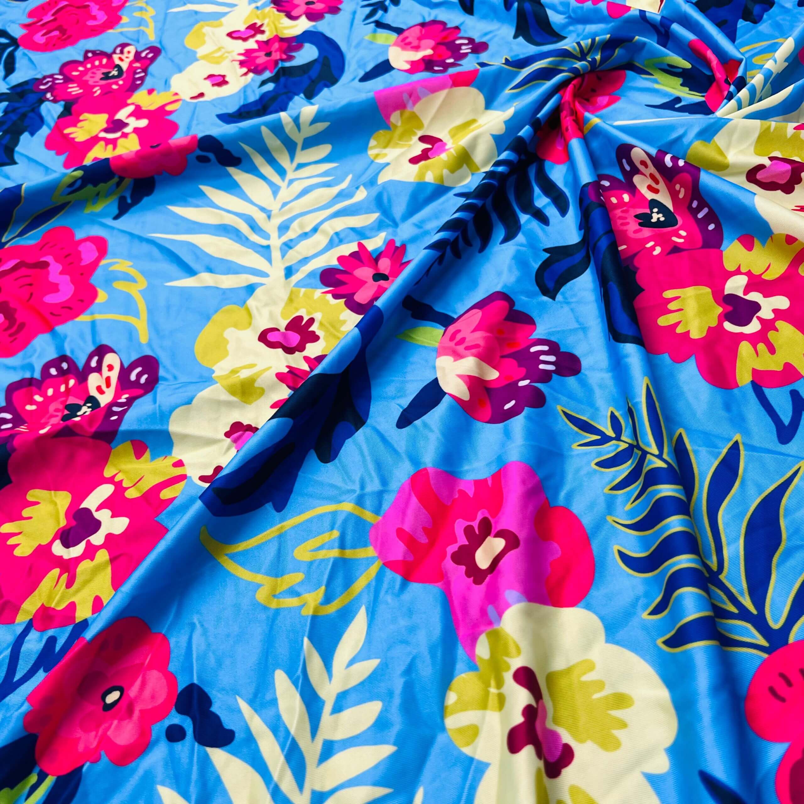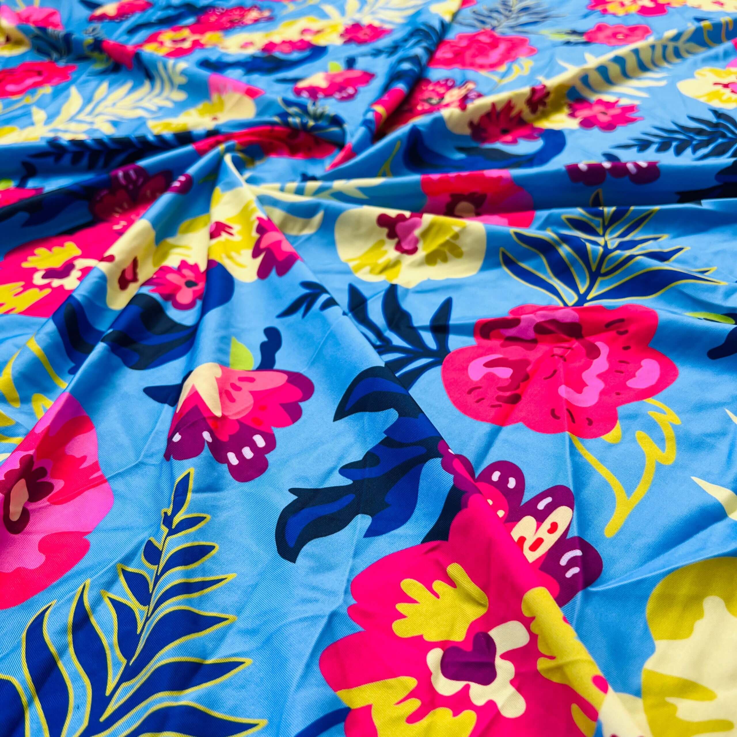 Tropical Flowers Blue Background Print Nylon Lycra Spandex Fabric 4 Way Stretch By Yard for swimwear dancewear gymwear sportwear dress (203-2)