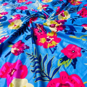 Tropical Flowers Blue Background Print Nylon Lycra Spandex Fabric 4 Way Stretch By Yard for swimwear dancewear gymwear sportwear dress (203-2)
