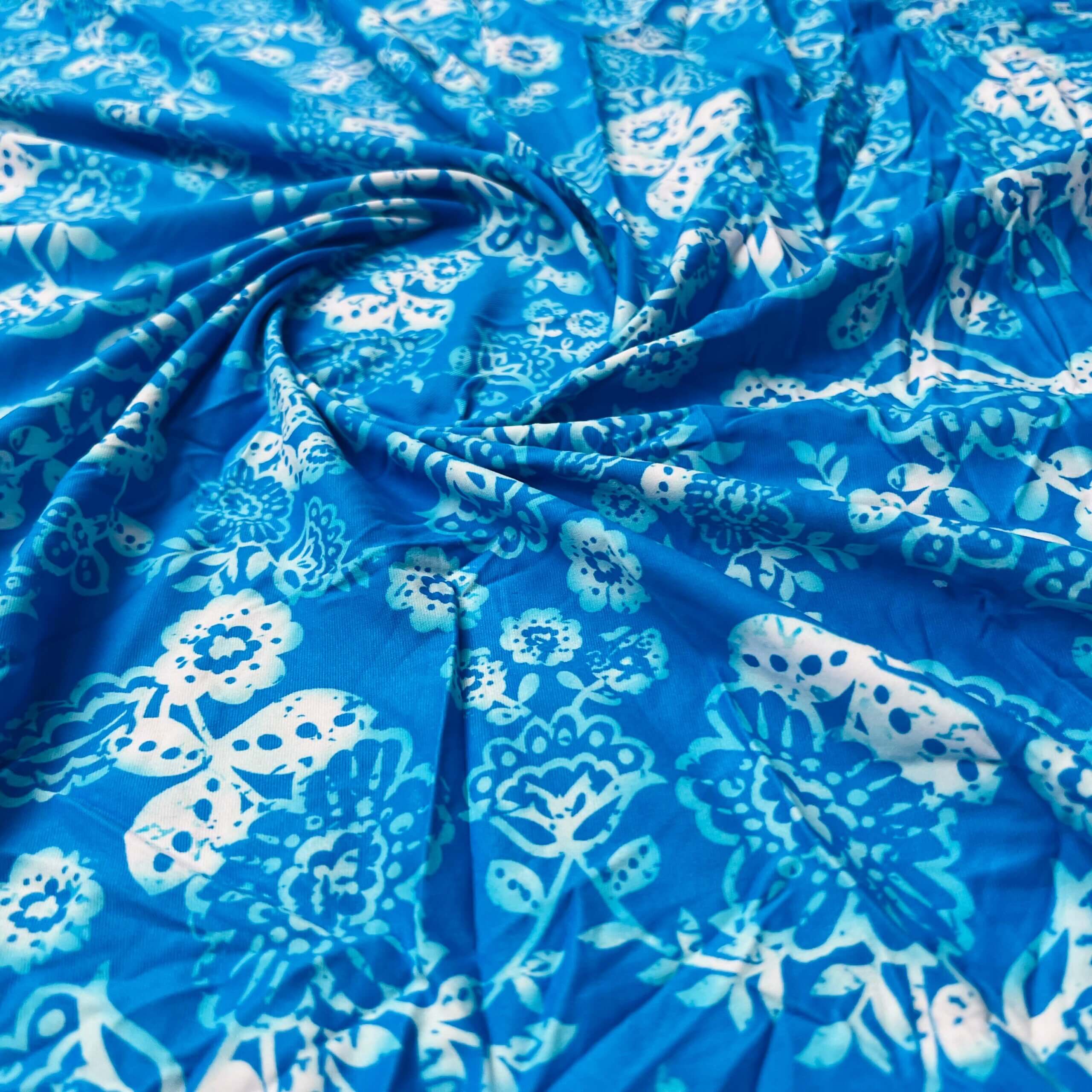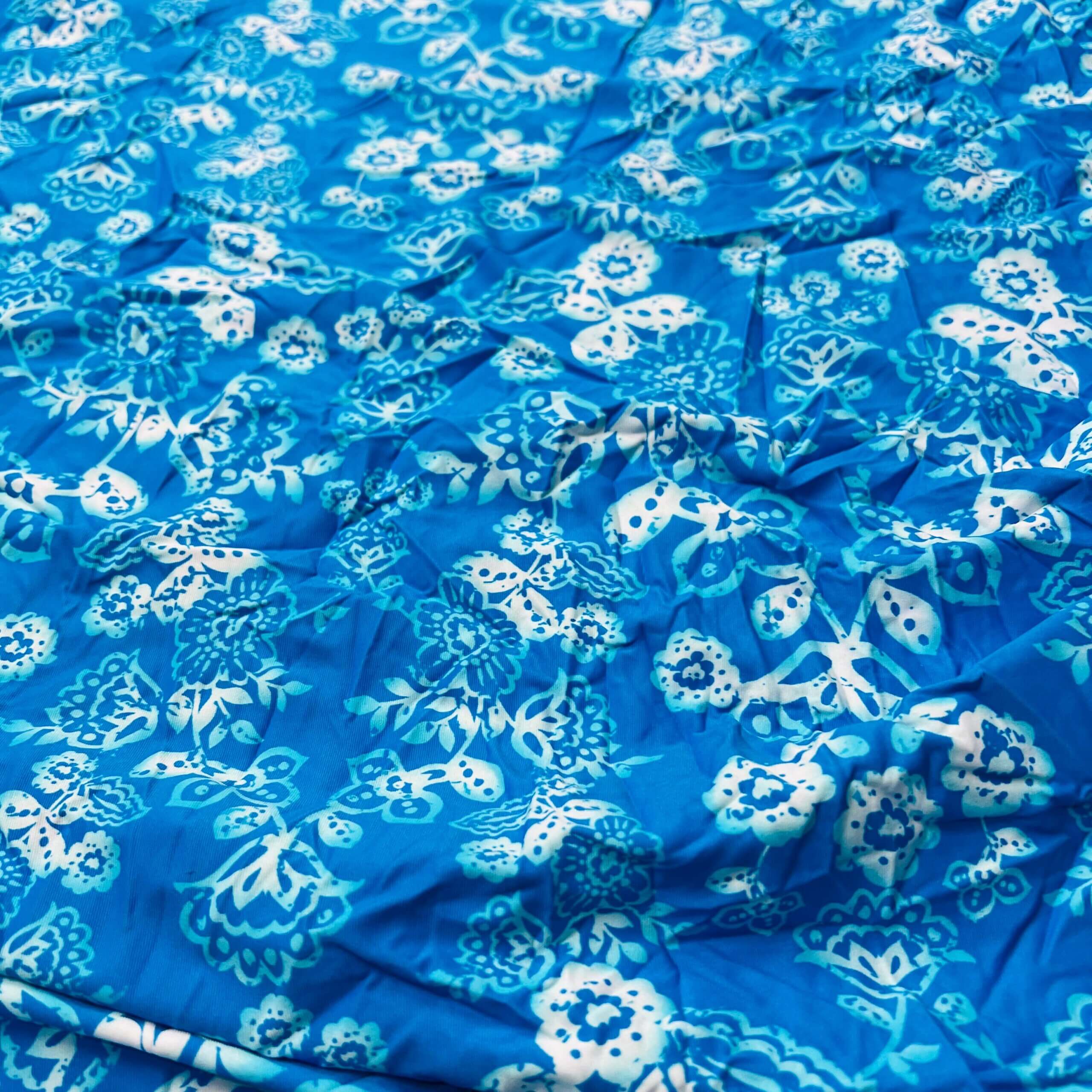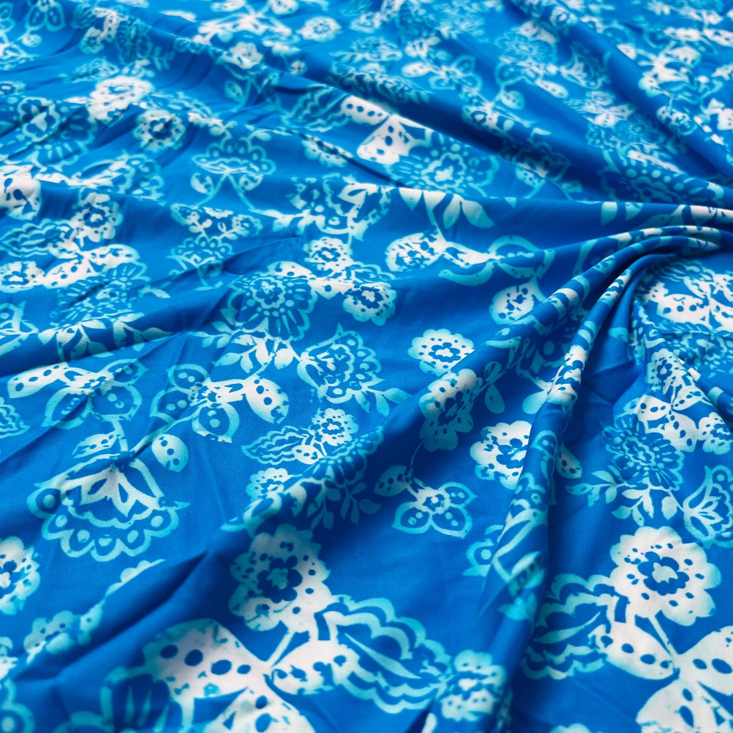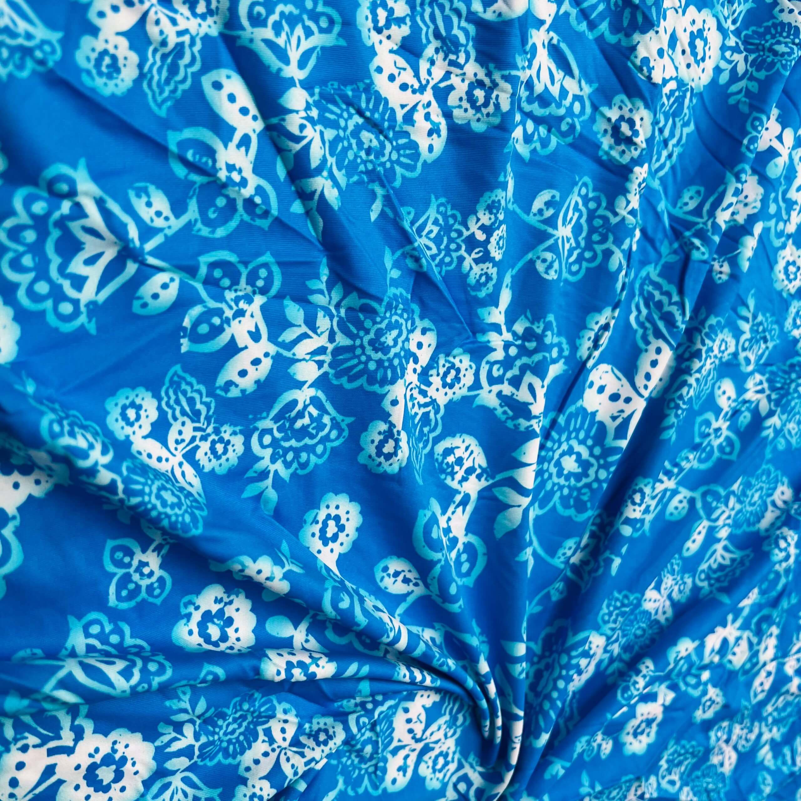 White Flowers Blue Background Print Nylon Lycra Spandex Fabric 4 Way Stretch By Yard for swimwear dancewear gymwear sportwear dress skirt (204-6)