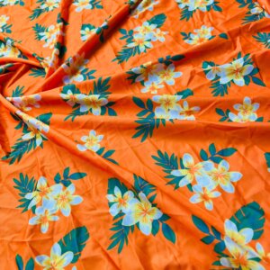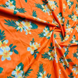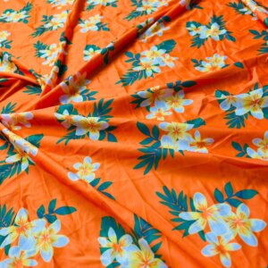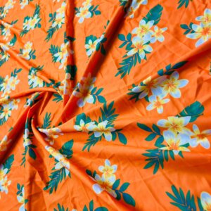 1 Yd 22″ Long White Flowers Orange Background Print Nylon Lycra Spandex Fabric 4 Way Stretch for swimwear dancewear gymwear sportwear dress (203-2)