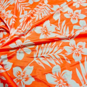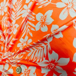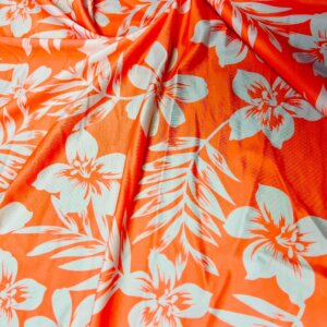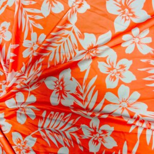 47″ Long White Hawaiian Flowers Orange Background Print Nylon Lycra Spandex Fabric 4 Way Stretch By Yard for swimwear dancewear gymwear sportwear dress skirt (239-9)